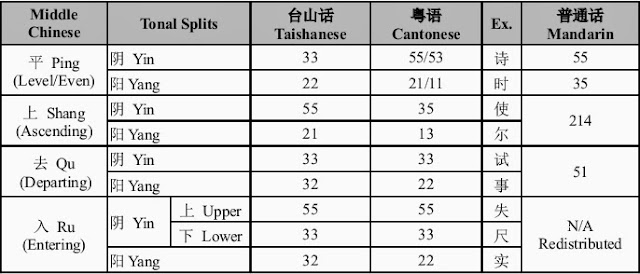Some Taishanese Ru syllables have the 21 tone contour. The tone is not included in the table because its evolution is of a different nature -- as a result of morphologically conditioned tone-change (变音). They are colloquial in nature and are few in number.