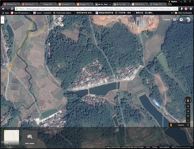 I then copied the village name to Google Map. Google Map displays place names in Simplified Characters while the DB uses Traditional Characters. However, Google Map accepts Traditional Characters on the search input box, so I pasted the village name as is in Chinese, typed in Taishan, Guangdong, China, et voila, here comes the Google earth view of my home village: